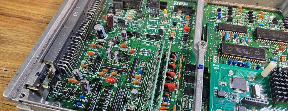 While this spare ECU hadn't been professionally serviced since 2015, it has received multiple visual inspections and ran our previous powertrain without any issue. So we at StudioVRM weren't expecting Garage Noir Auto to find too many problems. However, when Chris inspected our seemingly healthy ECU and ran it on his engine simulator, he found multiple worn components, two slightly leaky capacitors, and worrying signs of corrosion on some key contacts on the back of the main board.